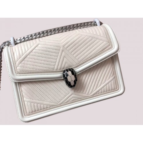 Shoulder bag "Serpenti Forever" featuring a "Framed Quilted" motif in nappa and heather amethyst smooth calf leather. Brass light gold plated tempting snake head closure in enamel, with eyes in onyx. Light gold plated chunky chain for a daywear attitude. Small size with one gusset, one zipped internal pocket and one open internal pocket. Internal metal tag featuring the Bvlgari logo, and pocket mirror.