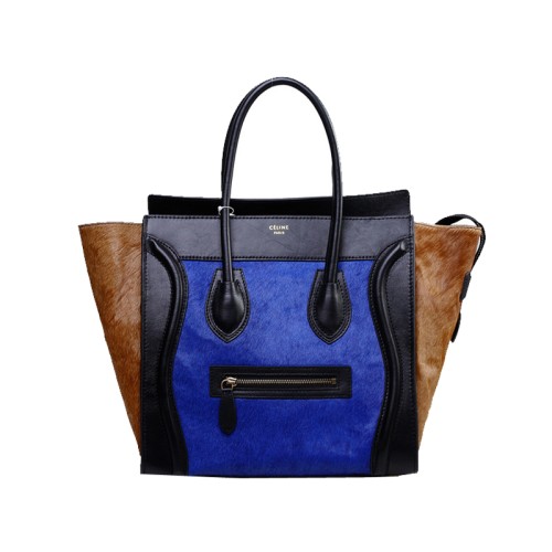 Celine Luggage Medium Tote In Calfskin Black / Pony Hair Blue