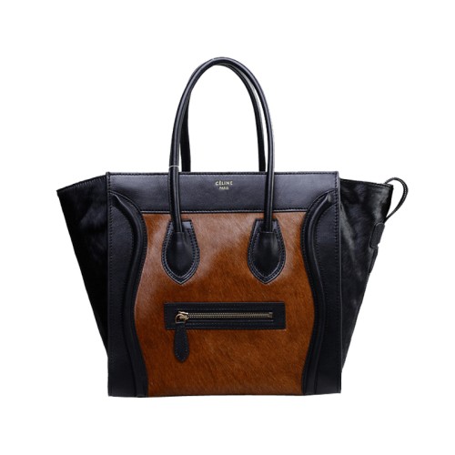 Celine Luggage Medium Tote In Calfskin Black / Pony Hair Brown