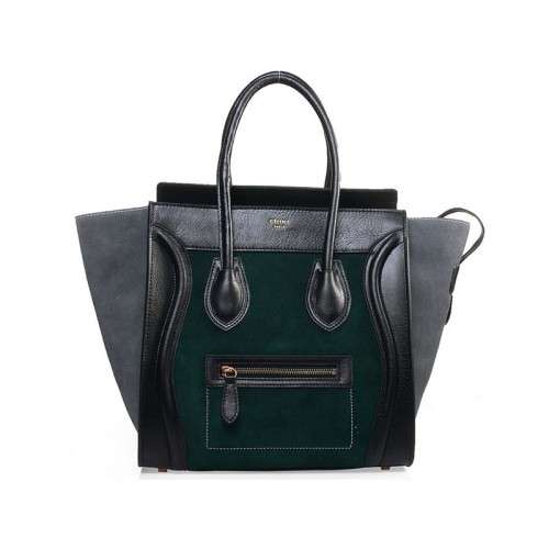 Celine Luggage Medium Tote In Calfskin Black /Suede Dark Green
