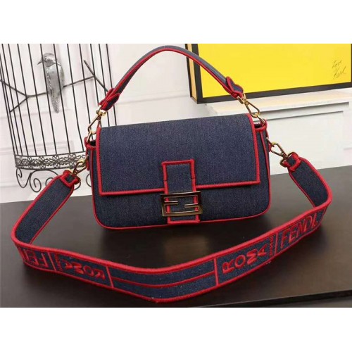 Iconic Baguette bag in large size, with flap and FF fastening with magnetic clasp. Lining with zip pocket. Can be carried by hand or worn cross-body thanks to its handle and shoulder strap, both detachable. Made of dark blue cotton denim, with red thread embroidery edges. Long shoulder strap personalised with Fendi Label embroidery. Gold-finish metalware.