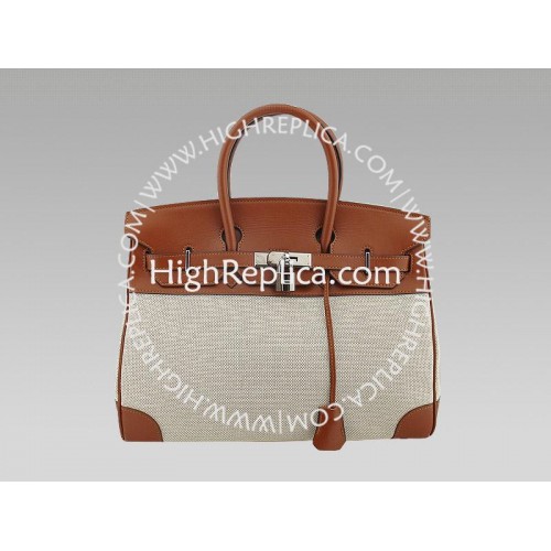 Our replica HERMES GOLD BROWN TOGO AND TOILE BIRKIN features a large inner compartment lined with luscious chevre leather, a large flat, inner pocket, silver hardware plated with palladium, Hermes lock and key with Hermes embossing, four protective feet prevent marks and scuffing on the base. Large double rolled handles enable you to carry, or wear this bag on your shoulder.