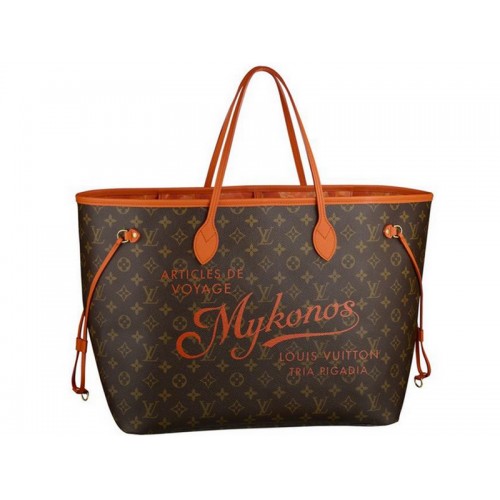 the spirit of summer .Louis Vuitton reinterprets its iconic neverfull in tribute to the world's most celebrated resorts Mykonos.vintage -style lettering .orange leather trim and a floral Ikat print lining add to the appeal of this limited-edition holdall , whose practical features and generous proportions make it the perfect choice both city and beach .