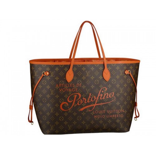Capturing the spirit of summer .Louis Vuitton reinterprets its iconic neverfull in tribute to the world's most celebrated resorts Portofino.vintage -style lettering .orange leather trim and a floral Ikat print lining add to the appeal of this limited-edition holdall , whose practical features and generous proportions make it the perfect choice both city and beach .