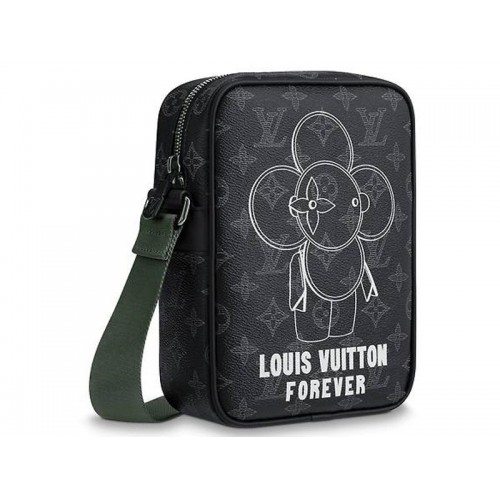 This compact Danube PM crafted of Monogram Eclipse canvas features a new version of Vivienne, the Louis Vuitton mascot, drawn by Kim Jones expressly for the Men’s 2018 Fall Precollection. A sleek city bag accented with black and green hardware, the Danube is equipped with an adjustable textile strap for shoulder- or cross-body carry.