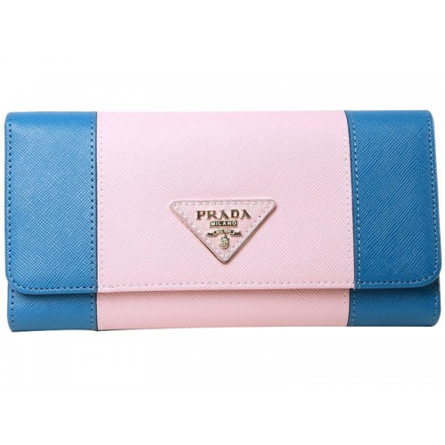 Prada Saffiano Leather Tri -Fold Wallet Blue With Pink