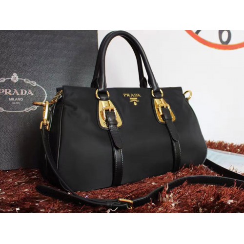 Prada Tessuto Nylon Soft Calf Leather Top Handle Bag Black